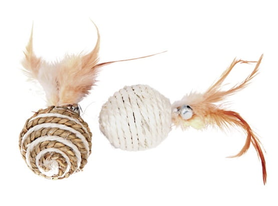 EKO piłki z piórkami dla kota zostały stworzone z sizalu i trawy morskiej. Dla większego pobudzenia do zabawy Twojego kota, piłki posiadają dzwoneczek przyczepiony przy ogonkach z piórek.