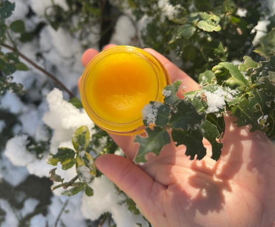 olej sojowy*, olej z palmy kokosowej*,masło shea*, behenian glicerolu, stearynian glicerolu, trójglicerydy c10-18, uwodorniony olej rycynowy, olej z nasion słonecznika*, wosk pszczeli, ekstrakt z nagietka lekarskiego*, tokoferol, izoeugenol, miód*.