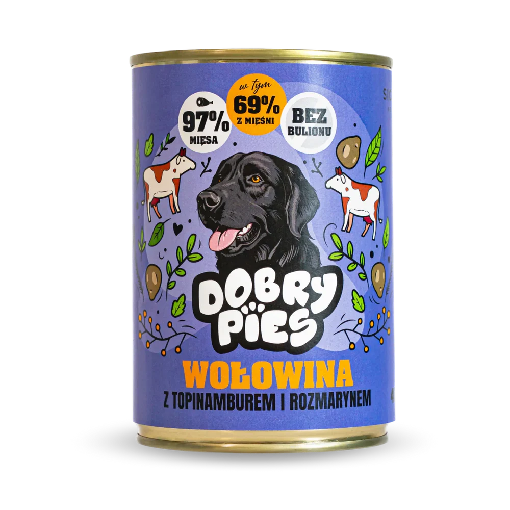 Połączenie wołowiny i wieprzowiny tworzy treściwą, mięsną bazę na każdy dzień. Topinambur wnosi naturalny błonnik wspierający trawienie, a rozmaryn delikatnie podkreśla smak. Recepturę uzupełnia olej z wiesiołka oraz spirulina. Dzięki temu karma jest lekkostrawna, dobrze przyswajalna i chętnie zjadana przez dorosłe psy wszystkich ras.